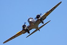 The Anson was equipped with a retractable undercarriage arrangement, which was uncommon upon its introduction; it holds the distinction of being the first aircraft to feature such an innovation to enter service with the RAF.[8][10] While the main undercarriage was retracted into recesses set into the bottom of the engine nacelles, the tail wheel was fixed in position. Commonly, the undercarriage was fitted with Dunlop-built wheels, tyres and pneumatic brakes and Turner legs.[5] The retractable undercarriage was mechanically operated; this mechanism also had a manually operated backup, in which a total of 144 turns of a crank handle, situated besides the pilot's seat, was necessitated.[11][12] To forgo this laborious process, early aircraft would often perform short flights with the landing gear remaining extended throughout, which would reduce the aircraft's cruising speed by 30 mph (50 km/h).[7]