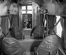 Immediately behind the pilot's position is a small folding seat fixed to the starboard side of the fuselage for an additional crew member or passenger, along with racks that would contain a pair of parachute packs that would be clipped onto the harnesses worn by both the pilot and the navigator. Behind these is the navigator's station, a chair and table provisioned with navigational aids such as compasses, Bigsworth chart boards, sea markers, calculators for course, wind and speed, a signalling lamp and float flares.[13] Aft of the rear spar is the wireless operator's station, this being a table furnished with contemporary wireless apparatus of the era, including a winch for the trailing aerial, which was attached to the upper fuselage immediately behind the aircraft's cockpit.[13]